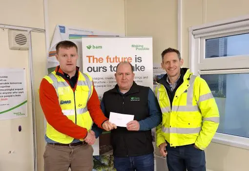 David Ward and Peter Abernethy were delighted to present Christy Hannon, Contracts Manager with Bam Civil, with a cheque for €1,000 for his chosen charity, Aoibheann’s Pink Tie.
